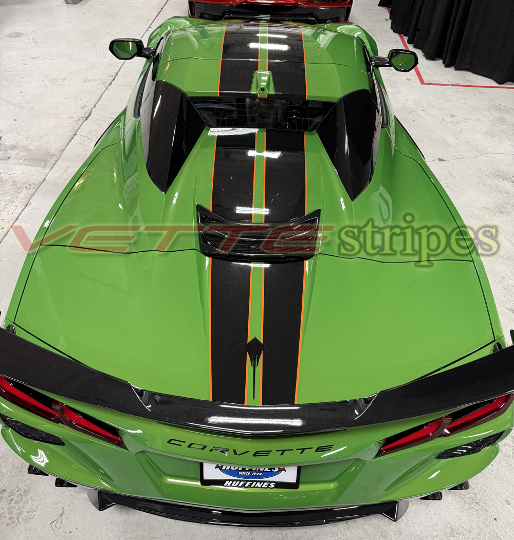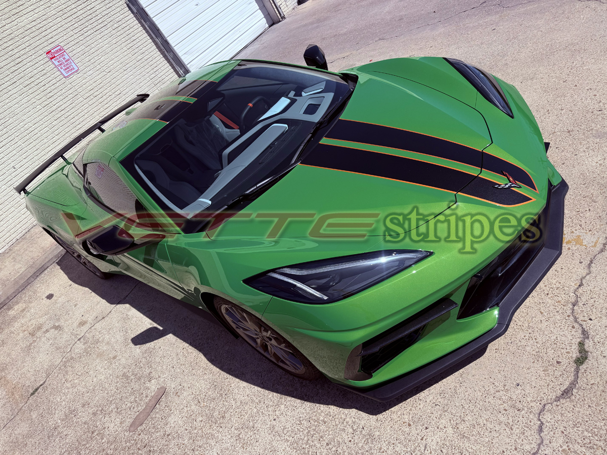 Welcome to 2020 – 2025 C8 Corvette Full Length 2024 style Dual Racing Stripes with pinstripes.
